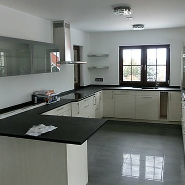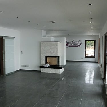 Erdgeschoss: Offene Wohnküche und ein weitläufiger Wohnbereich mit direktem Terrassenzugang. Besonders komfortabel: Der direkte Zugang vom Wohnhaus in die Doppelgarage.